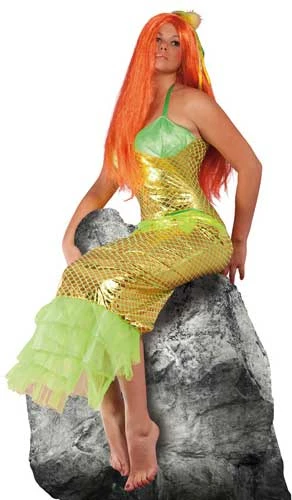 Ce Costume de sirène est composé d’une robe satiné de couleur verte et or à bretelles, et d’un serre-tête pour les cheveux.