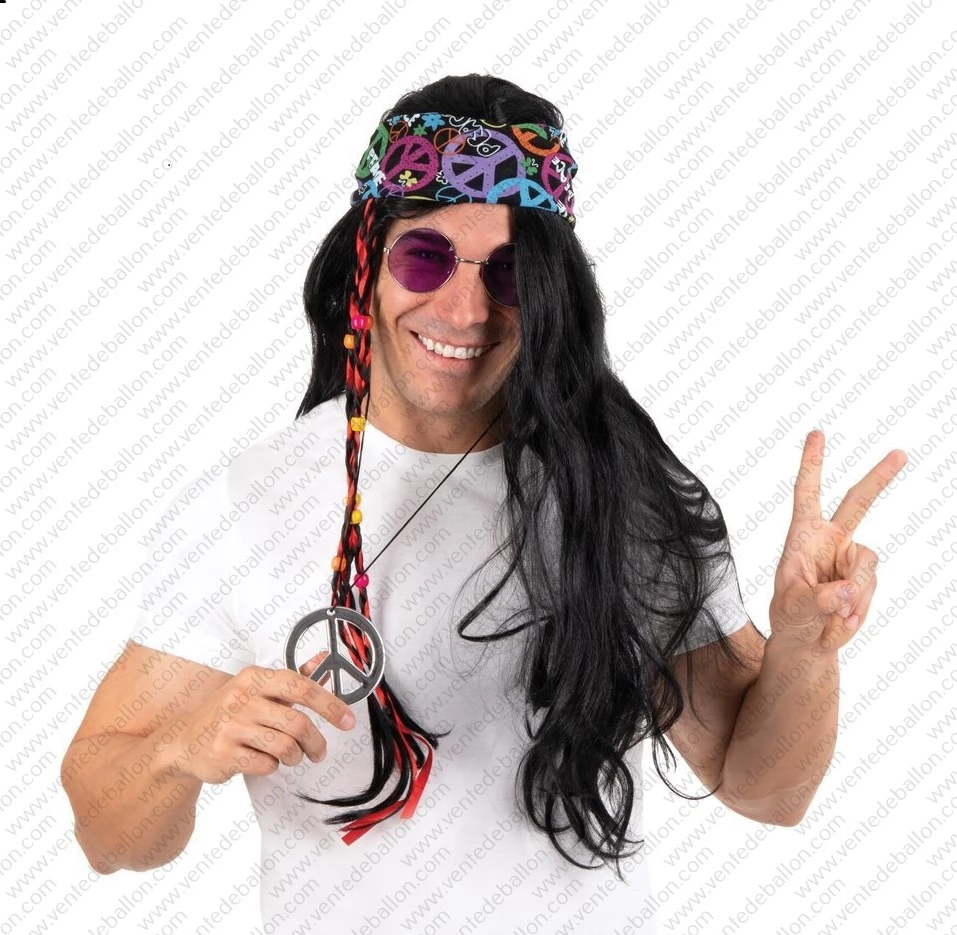 Perruque Hippie Homme – Raide Noire Avec Tresse En Tissu
