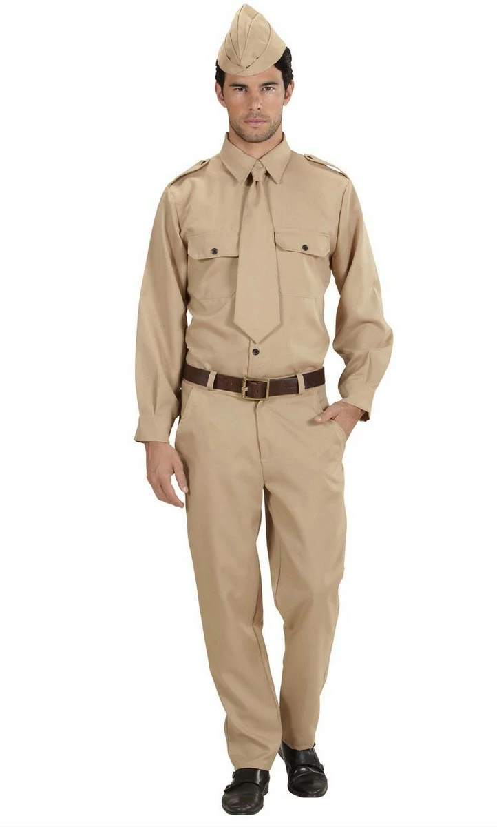 Ce déguisement de Greg Boyington dit « Pappy » aviateur américain de la 2nd Guerre Mondiale se compose d’un pantalon, d’une chemise, d’une cravate et d’un chapeau. Le pantalon marron élastique sur l’arrière de la taille a une fermeture éclair et un bouton sur le devant. La chemise est assortie .
